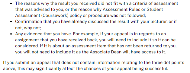 在 course convener审核后,如果学生认为问题依然存在,则有权利提交正式的成绩申诉请求。学生必须在收到成绩后或者 course convener审核后的20个工作日提交书面申诉请求至课程所在系的Associate Dean。在收到申诉请求后,Associate Dean 会进一步调查并在与相关老师商量后,做出申诉答复。通常,学生会在提交申诉后的20个工作日内得到申诉结果。