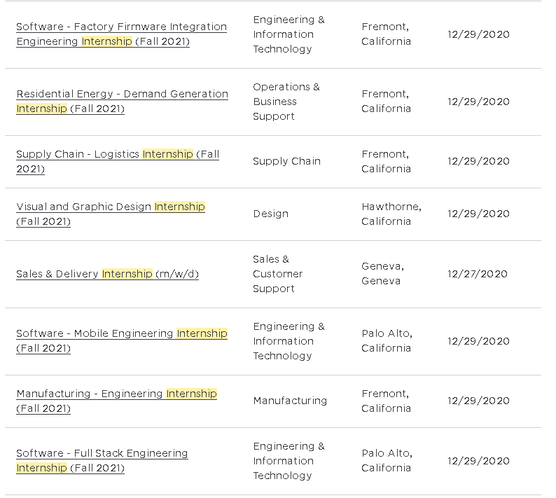 特斯拉在去年12.30就发布了2021年暑假的实习岗位,主要包括供应链、视觉与图形设计、全栈工程师、电气工程师、设计、运营、会计、视频及图片制作和电子游戏工程等,都是12周的全日制实习,也支持CPT: