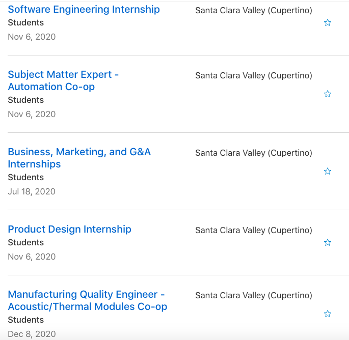 苹果也去年就提前发布了暑期的信息,包括市场、管理、法律、产品设计、销售和软件工程师等,甚至官网7月开始就发布了2021年暑期全日制实习的岗位,但到现在也还没撤销,说明还是在看适合的候选人,大家也可以去投投看: