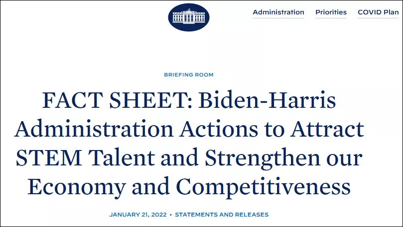 https://www.whitehouse.gov/briefing-room/statements-releases/2022/01/21/fact-sheet-biden-harris-administration-actions-to-attract-stem-talent-and-strengthen-our-economy-and-competitiveness/