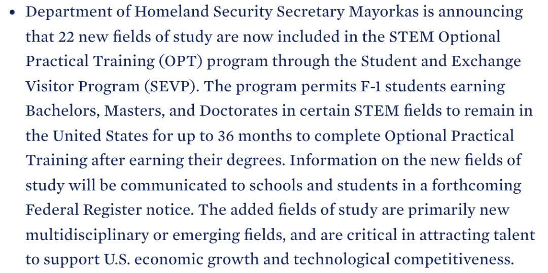 签证新规里,最最最大的亮点,莫过于OPT延期!国土安全部称,STEM 可选实习培训 (OPT) 计划总共增加了 22 个专业。而这将允许在 STEM 领域获得学士、硕士或博士学位的 F-1 学生享有在美国停留最多三年的签证!