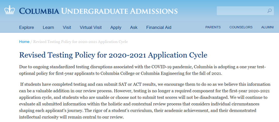 哥伦比亚大学官网宣布:2021年秋季入学的新生实行一年的“test optional”政策,适用于哥伦比亚学院(Columbia College)或哥伦比亚工程学院(Columbia Engineering)的申请者。