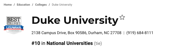 除了这所学校以外,还有一所学校,也就是S妈妈滋味中意,且排名全美护理学院第二的——杜克大学(Duke University)。S妈妈在我们沟通的过程中,多次提到自己对于这所学校和项目的喜欢。她的喜欢不是没有道理的:全美综合排名第十,护理专业全诶排名第二。