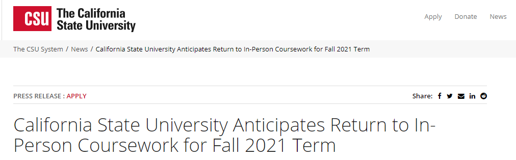 加州州立大学系统宣布2021年秋季将恢复线下授课,多数学校会保留部分网课模式,同时保障学生在校园里的安全社交距离。23个校区中有10个设有疫苗接种中心,鼓励学生利用好这些医疗资源。