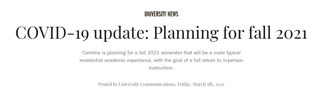 北卡罗来纳大学教堂山分校也在近期公布了最新的秋季学期计划——计划在2021年秋季目标是全面回归到亲自授课。学校在保持现有的许多安全措施外,在今后几周和几个月将继续监测疫情轨迹时,并最终确定细节。