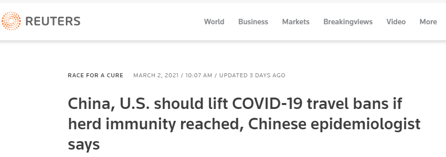 路透社报道,在北京清华大学和美国布鲁金斯学会共同举办的云论坛上,中国疾病预防控制中心流行病学首席专家吴尊友在论坛中提出,如果中美共同抗疫,很有可能可在8月或9月真正解除旅行限制。