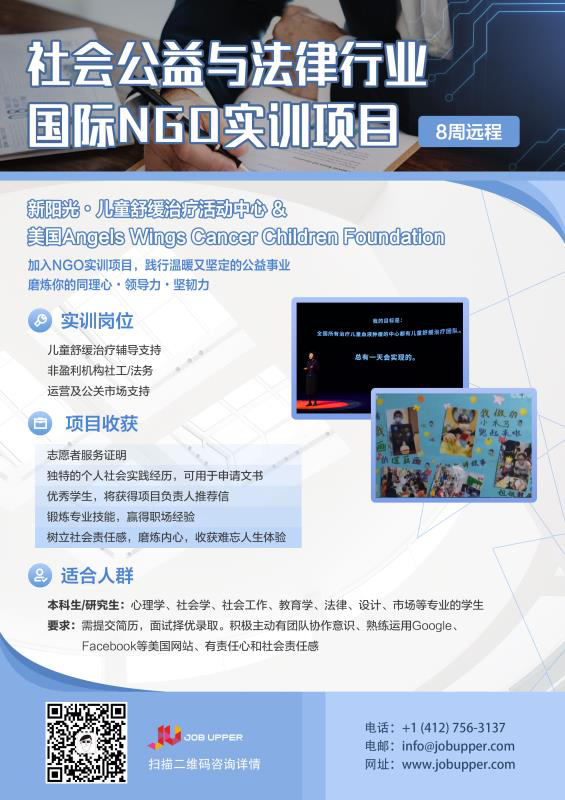 “儿童舒缓治疗专项基金项目”同时还与美国Angels Wings Cancer Children Foundation(天使之翼儿童癌症基金会)联合,将协作完成机构在美国注册的法务流程。现在面向广大留学生,公开招募志愿实习生,其中包括以下3个领域的专业实践: