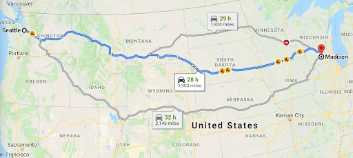 然后,她就这样和儿子一起,开车横穿了六个州:华盛顿州,爱达荷州,怀俄明州,北达科塔州,明尼苏达州,然后到达了威斯康星州,一共是将近2000英里,28小时车程。