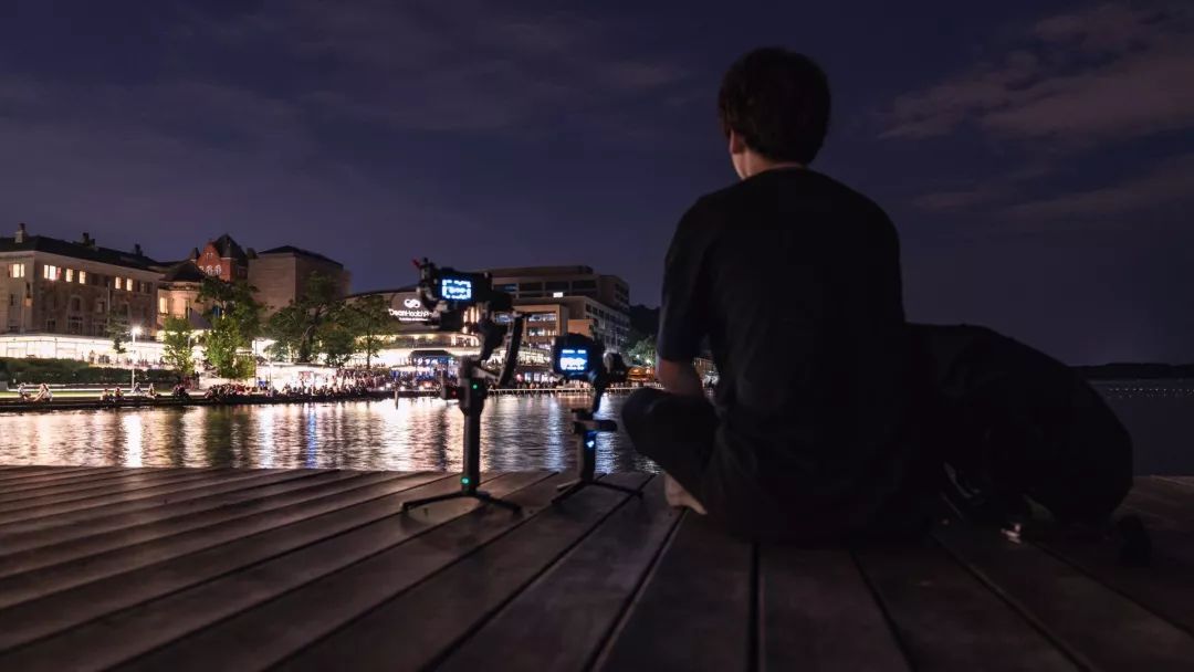 Chuck和两个相机一起在威斯康星麦迪逊大学校园里望着远处的灯火。他的下一个梦想是什么?
