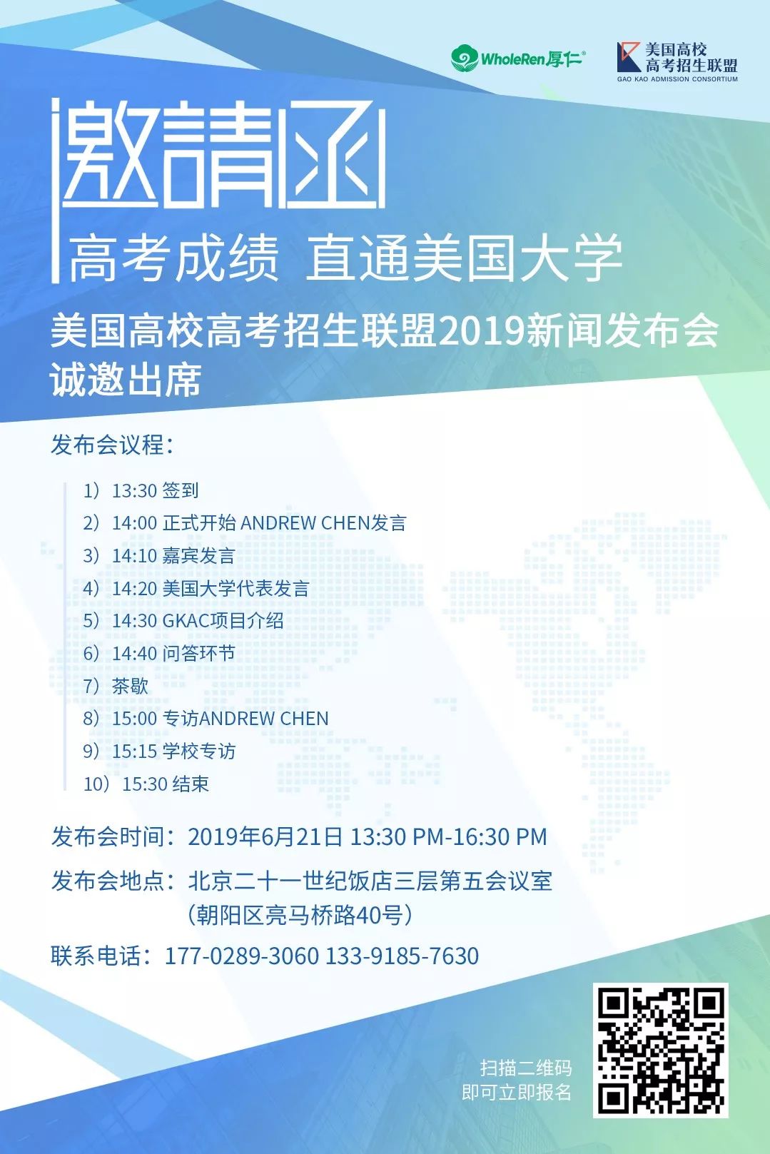 还想了解更多?现在是最好的时机!美国高校 高考 招生联盟2019年新闻发布会将于本周五(2019年6月21日)下午,在北京二十一世纪饭店举行。十年寒窗,比不上插上机会的翅膀!扫描下方邀请函中的二维码,立即免费报名吧: