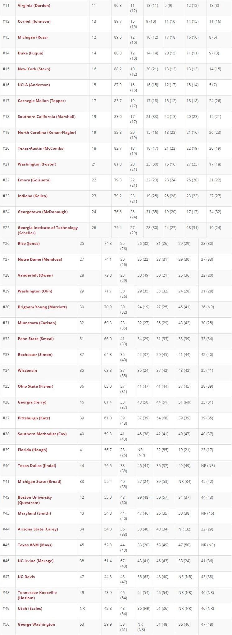 莱斯大学的琼斯商学院跌出了前25名,排名下降一位至26。这一位置由乔治亚理工学院谢勒商学院取代。