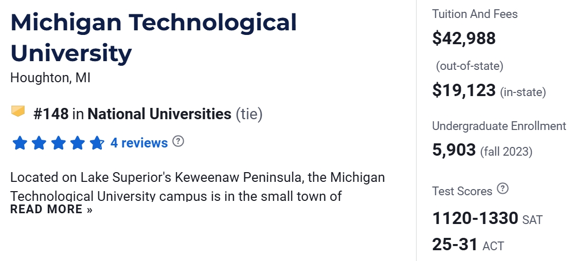 密歇根理工大学 Michigan Technological University 是采矿业在美国兴起的结果,以采矿学和冶金工程学为开端,发展成为拥有科学、工程学、林学、商学、电信学和技术学的综合性大学。在全美公立大学排名位居前50,工程类专业排名前10,是全美第8安全校园。以培养工程师、科学家、制造业专家、森林学家、通讯人才、高级商业人员而著名。
