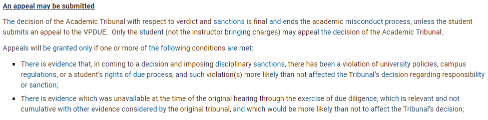 除非学生向 VPDUEGE 提出上诉,否则学术法庭关于裁决和处分的决定是最终决定,并结束学术不端行为程序。只有学生(而不是提出指控的教师)可以对学术法庭的决定提出上诉。