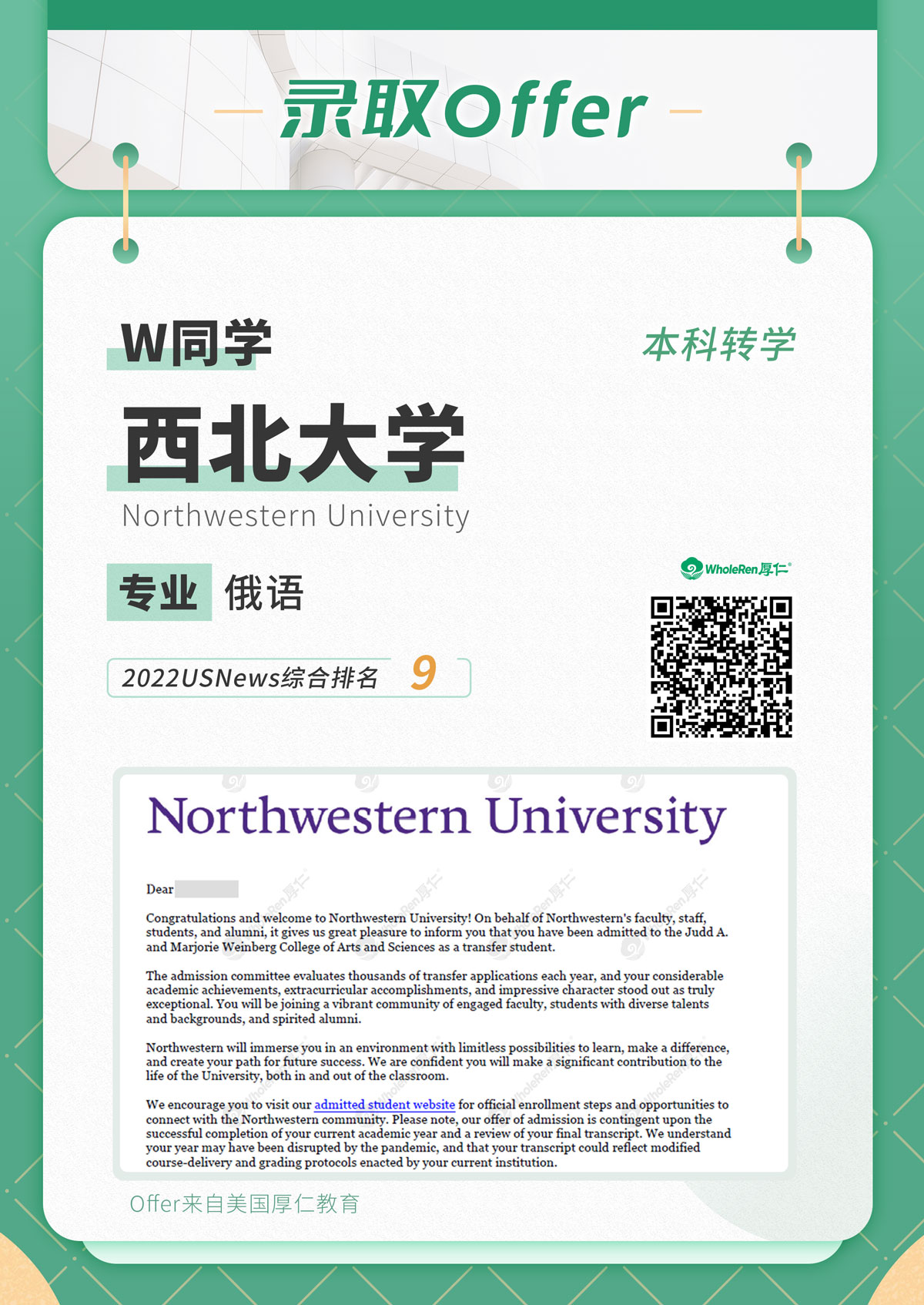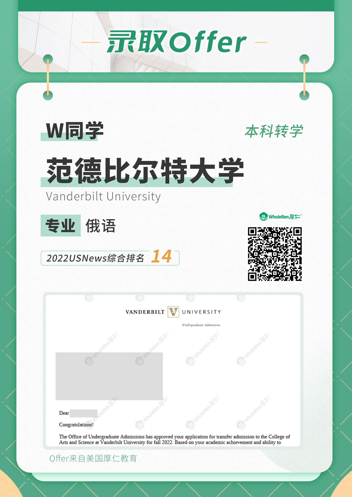 在W同学的积极配合下,最终获得了西北大学,华大圣路易斯,布朗大学,范德堡大学等多所TOP20大学的录取offer,实现了当初的名校梦想。