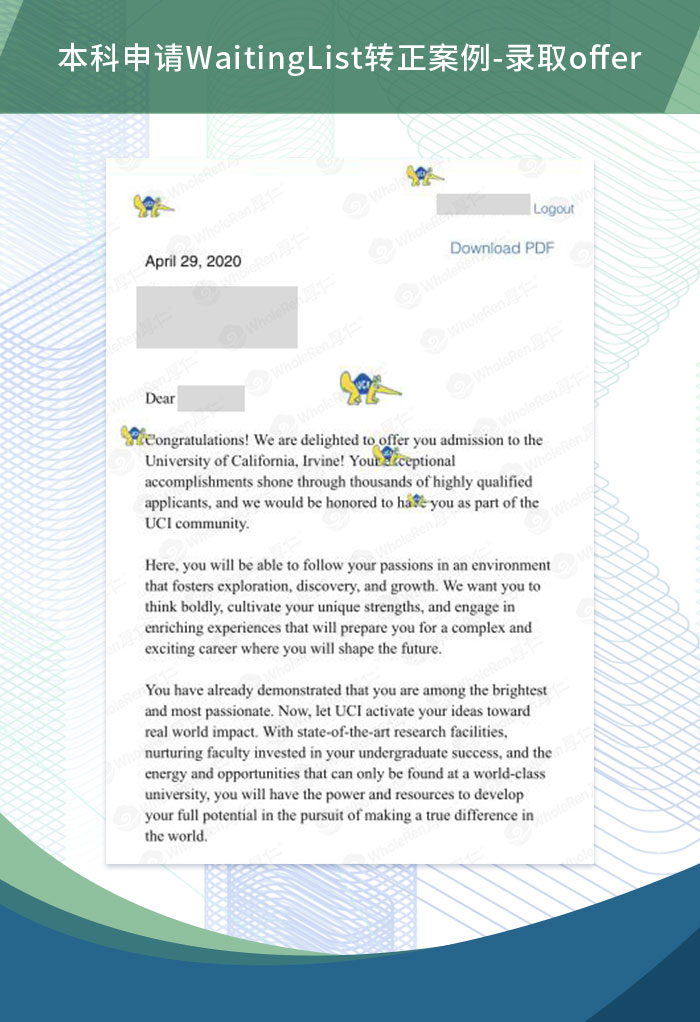 最终在厚仁老师的有效指导下,W同学终于拿到UCI的转正录取,恭喜W同学圆梦名校,未来可期!