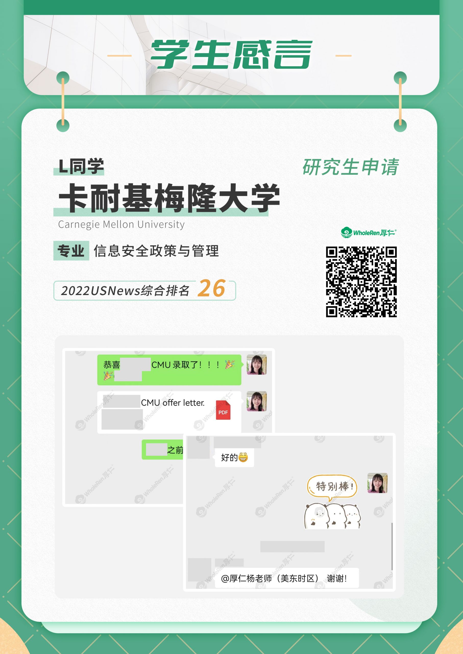 目前L同学收到了卡内基梅隆大学,波士顿大学,匹兹堡大学等录取。祝贺L同学,厚仁团队将陪伴L同学一路前行!