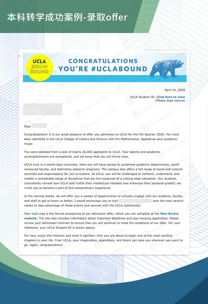 在妥善解决这两个核心难题后,我们帮助J同学润色转学文书,达到较高质量,并保持和UC学校的良好沟通。最终帮助J同学成功斩获梦校UCLA等多所学校录取。祝J同学前途似锦,未来可期!