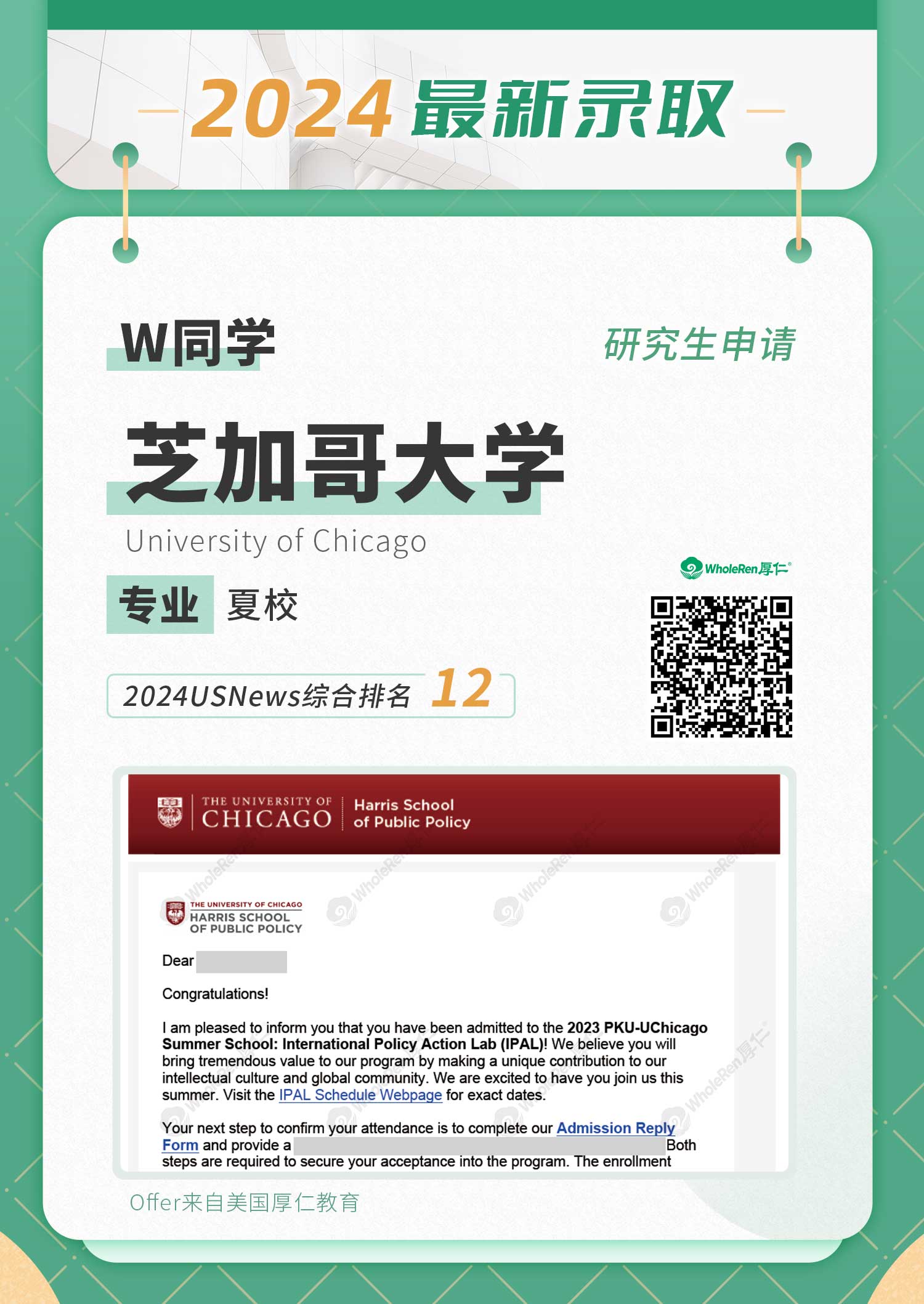 申请时,由于W同学是厚仁长期服务的学生,厚仁团队对学生的整体背景和诉求有很充分的了解,学生也比较配合。选校阶段,学生的目标明确,希望申请排名更高的顶级名校,专业没有太多倾向。申请团队推荐了公共政策方向。在背景提升方面,在本科阶段,我们为W同学规划了多段厚仁求职的实习/科研项目,丰富自身背景。在课外活动方面,针对申请方向,我们为W同学申请了芝加哥大学和北大合作的对口项目夏校,对申请帮助很大。