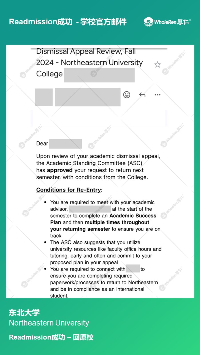 专家老师在了解学生的情况后,分析学生在学习中存在的问题及改善计划,指导学生完成优质文书证明学习能力,最终成功Readmission回原校。