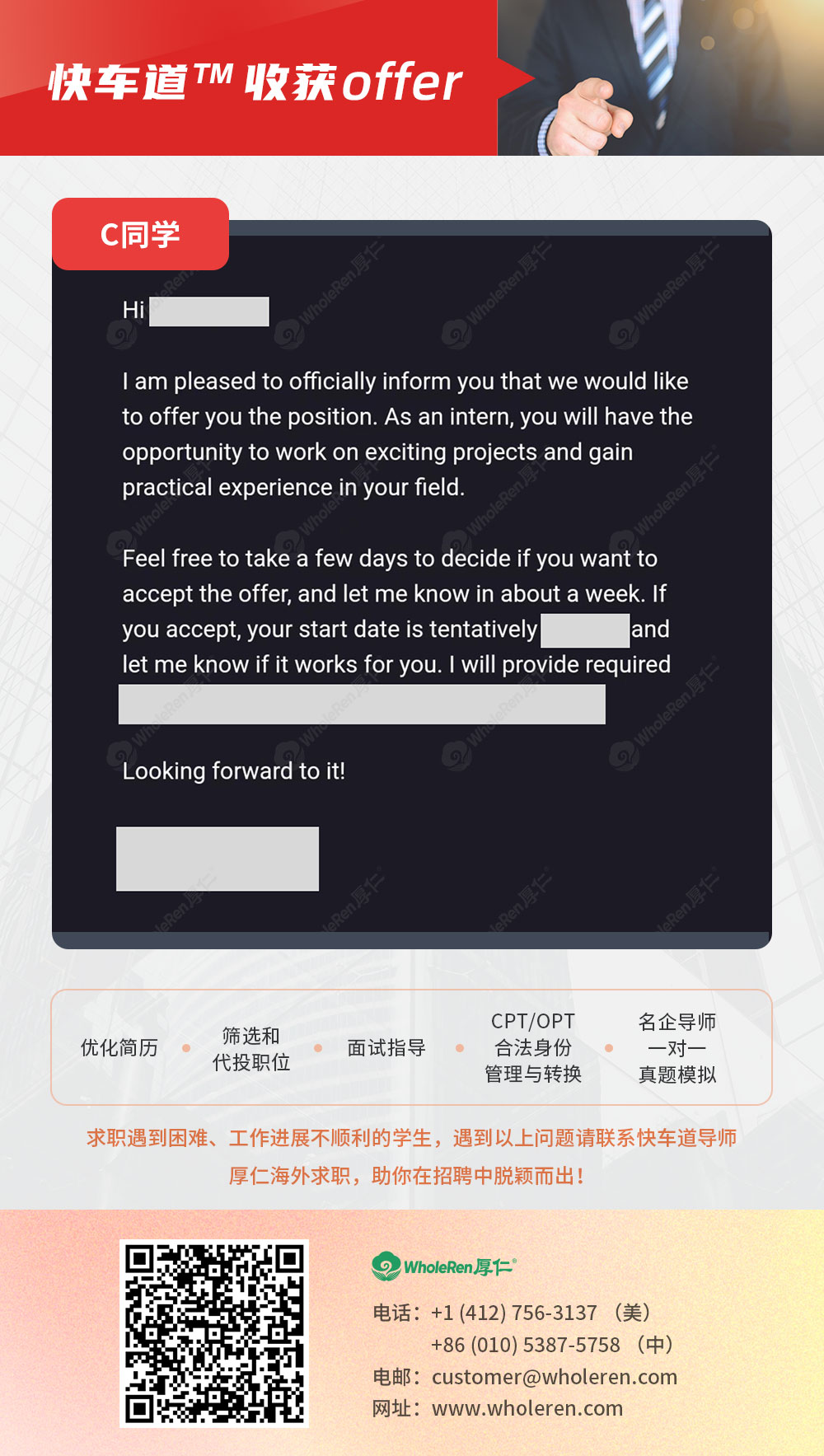 Z同学进入快车道™服务后,厚仁导师带领学生完成简历打磨,通过对各平台岗位筛选及帮助Z同学精准投递简历60家公司便拿到了面试机会!厚仁外籍导师对Z同学进行多轮面试培训使其面试技能大有提升。最终,Z同学收获当地一家声誉很高的注册会计师事务所会计实习offer!