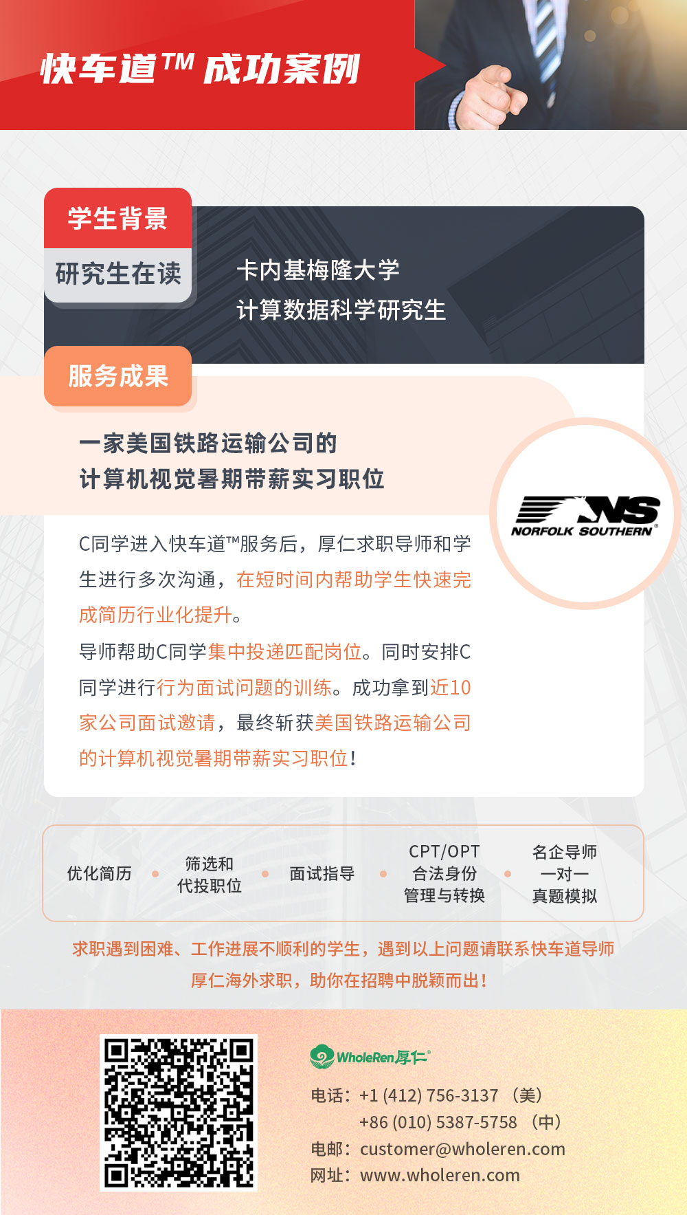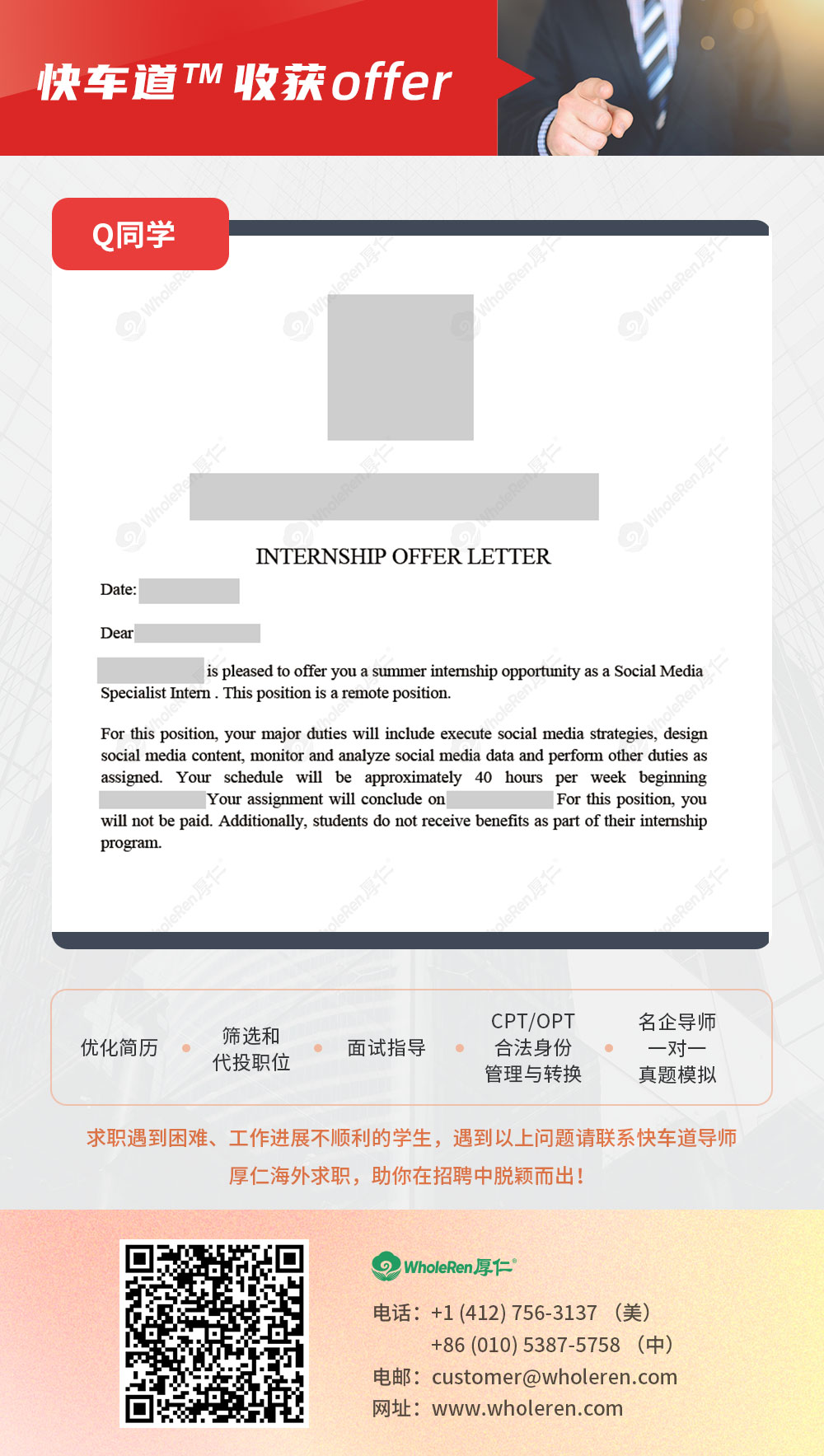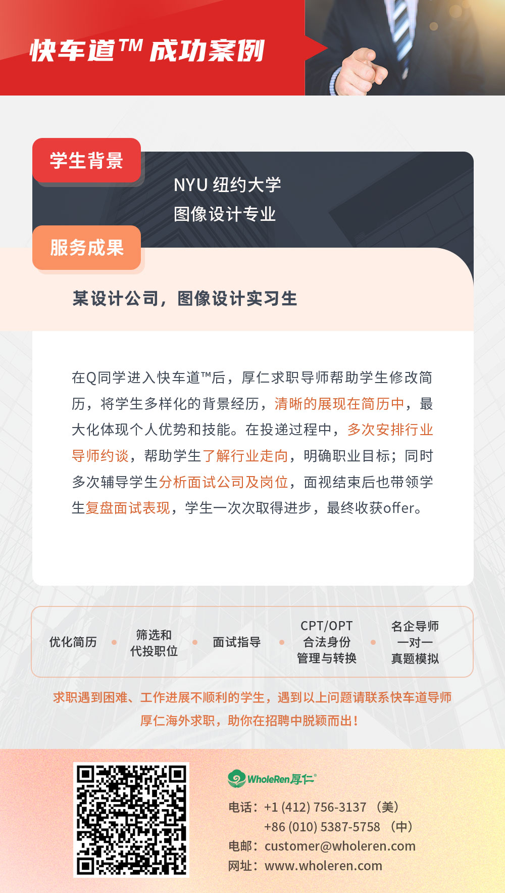 在Q同学进入快车道™️后,厚仁求职导师帮助学生修改简历,将学生多样化的背景经历,清晰的展现在简历中,最大化体现个人优势和技能。在投递过程中,多次安排行业导师约谈,帮助学生了解行业走向,明确职业目标;同时多次辅导学生分析面试公司及岗位,面视结束后也带领学生复盘面试表现,学生一次次取得进步,最终收获offer。