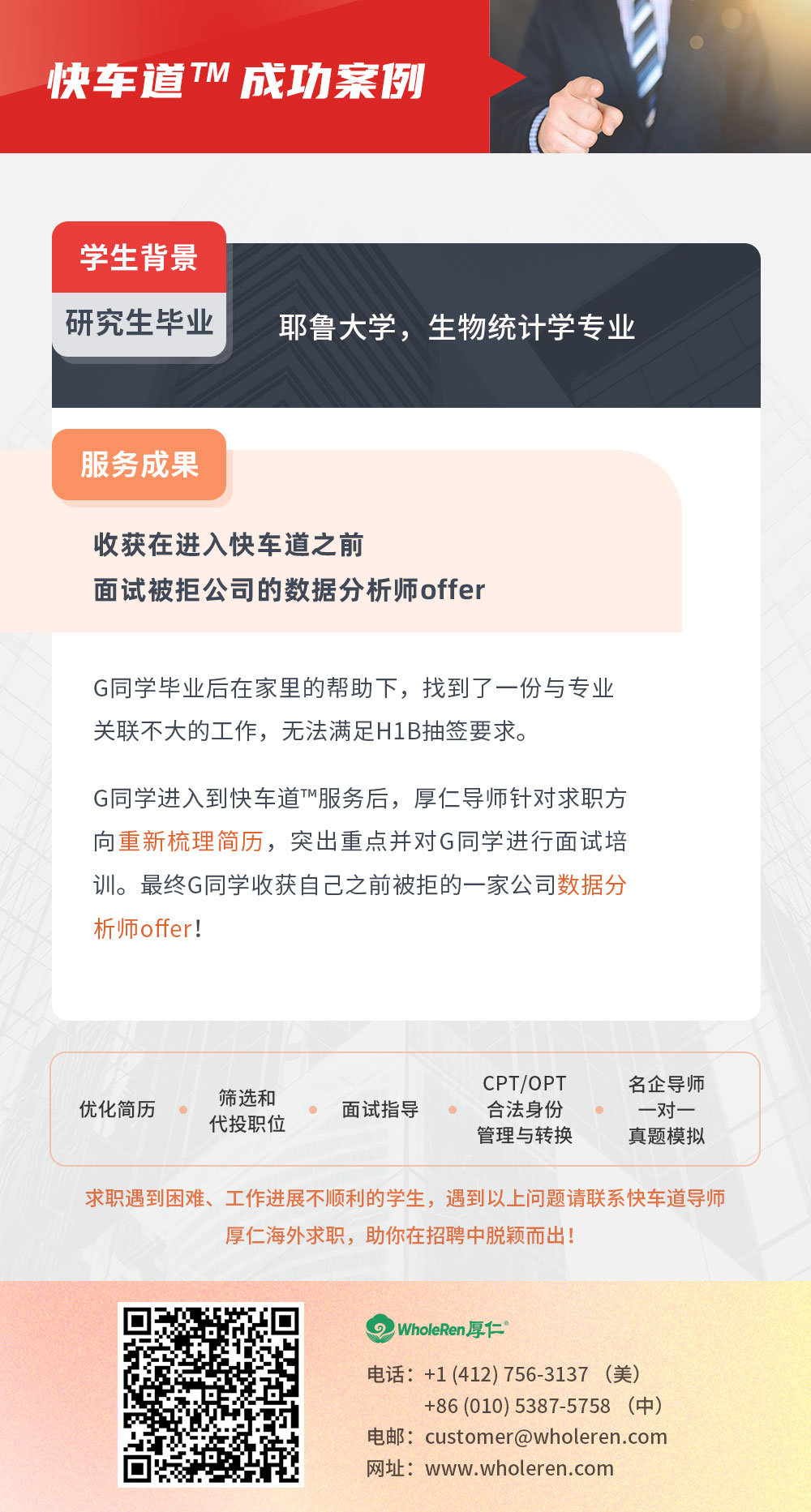 G同学毕业后在家里的帮助下,找到了一份与专业关联不大的工作,无法满足H1B抽签要求。G同学进入到快车道™服务后,厚仁导师针对求职方向重新梳理简历,突出重点并对G同学进行面试培训。最终G同学收获自己之前被拒的一家公司数据分析师offer!