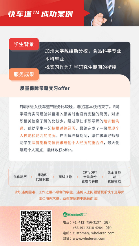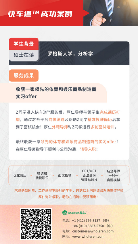 Z同学进入快车道™服务后,厚仁导师带领学生完成简历打磨,通过对各平台岗位筛选及帮助Z同学精准投递简历后拿到了面试机会!厚仁外籍导师对Z同学进行多轮面试培训。最终收获一家领先的体育和娱乐商品制造商的实习offer!在厚仁导师指导下顺利与公司沟通,辅导入职!