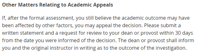 在与任课老师沟通后,如果学生认定自己的成绩依然存在错误或者异议没有充分的解决,学生有权利提交正式的成绩申诉。关于成绩的申诉,学生需要在与任课老师沟通后的30天内提交至课程所在院系Dean’s Office。学生应该在申诉中详细解释申诉的原因,与任课老师沟通的过程,以及提交相应的证据和$20申诉费用。在收到学生的成绩申诉后,学院会组织相应的老师在充分调查后做出答复。